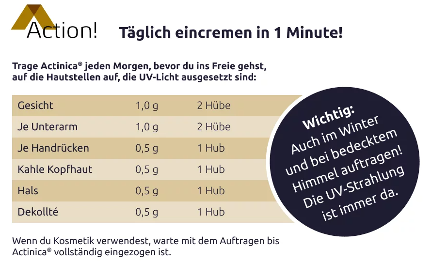Actinica® Lotion beugt bei täglicher Anwendung nicht nur hellem Hautkrebs vor, sondern trägt bei täglicher Anwendung aufgrund des sehr hohen UV-Schutzes zur Rückbildung bereits bestehender Aktinischer Keratosen auf der Haut bei. In einer wissenschaftlichen Studie1 wurde bei regelmäßiger Anwendung nach 24 Monaten ein 53-prozentiger Rückgang von Aktinischen Keratosen, den Vorstufen von hellem/weißem Hautkrebs, verzeichnet. Außerdem wurden im selben Zeitraum bei regelmäßiger Anwendung keine neuen Plattenepithelkarzinome bei den Patienten festgestellt.