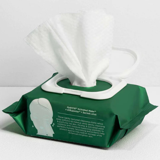Diese leicht strukturierte Reinigungstücher entfernen in einem Zug Verschmutzungen und Make-up, während sie die Haut sanft reinigen und klären.