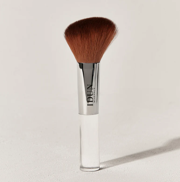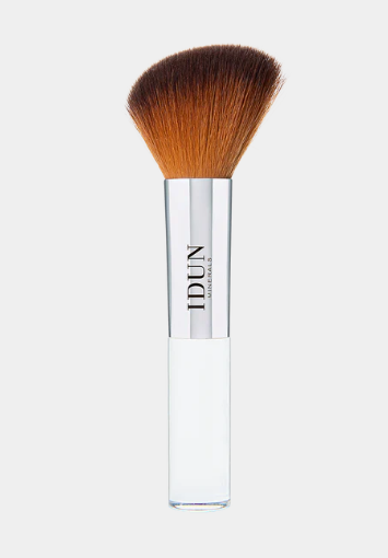 Tragen Sie die Puderformel mit dem Bronzer-/Rouge-Pinsel von IDUN Minerals sanft auf die definierten Bereiche auf, um ein präzises Auftragen und ein nahtloses Finish zu erzielen, und polieren Sie die Textur zu einem verblendeten Finish.