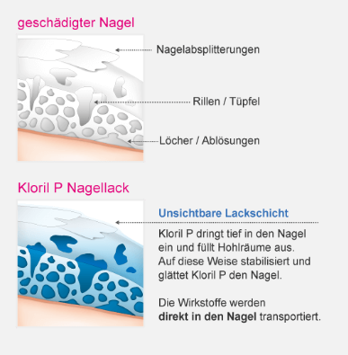 Spülen, Putzen, Tippen, Gärtnern – gerade unsere Fingernägel müssen täglich ganz schön viel aushalten. Kein Wunder, dass sie bei zu hoher Beanspruchung einreissen, splittern oder ganz abbrechen. Zu den Hauptursachen für brüchige Nägel zählen Überbeanspruchung, falsche Nagelpflege und fehlende Nährstoffe. Kloril P ist ein medizinischer Nagellack mit patentierter Lacktechnologie. Dank der einzigartigen Kombination aus Hydroxypropylchitosan (HPCH), Kieselsäure (Silicium) und Schwefel (MSM) remineralisiert und kräftigt Kloril P Nagellack die geschädigten Nägel innerhalb weniger Wochen und baut sie wieder auf.